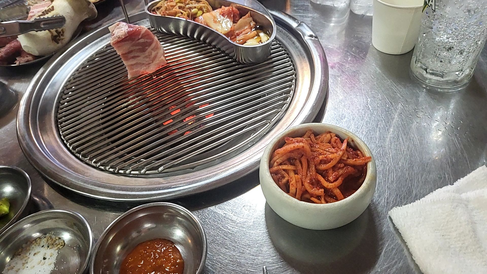맛있는 삼겹살을 기다리며 좀 참았다.