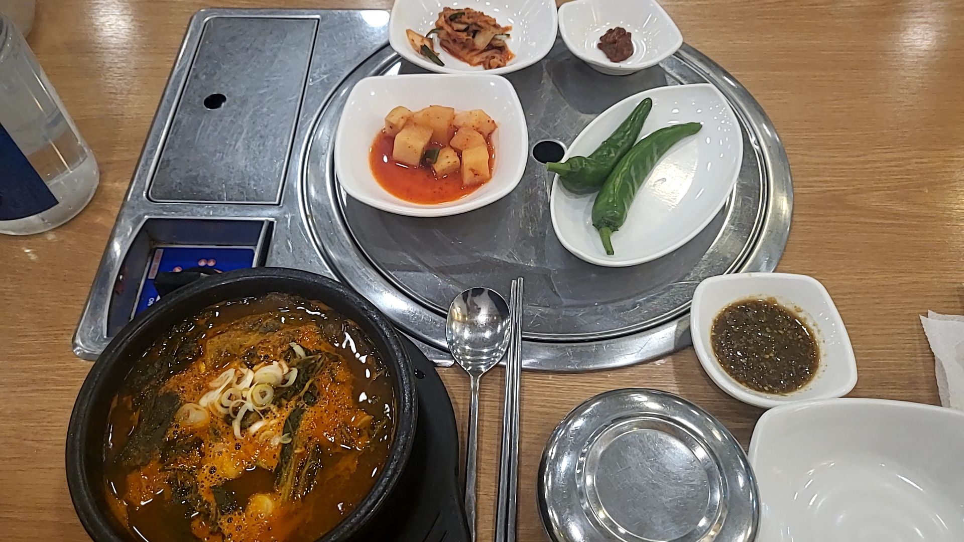 별다른 큰 기대는 하지않고 국물을 한 숟갈 먹어봤는데, 국물에서 깊은 맛이 느껴졌다. 선지 비린내는 하나도 안 나고, 감자탕 육수?인 거 같았다. 깍두기도 적당하게 익어서 해장국의 느끼함을 잡아주었다. 배추김치는 약간 덜 익은 상태었지만 나름 해장국과 먹을 만했다.