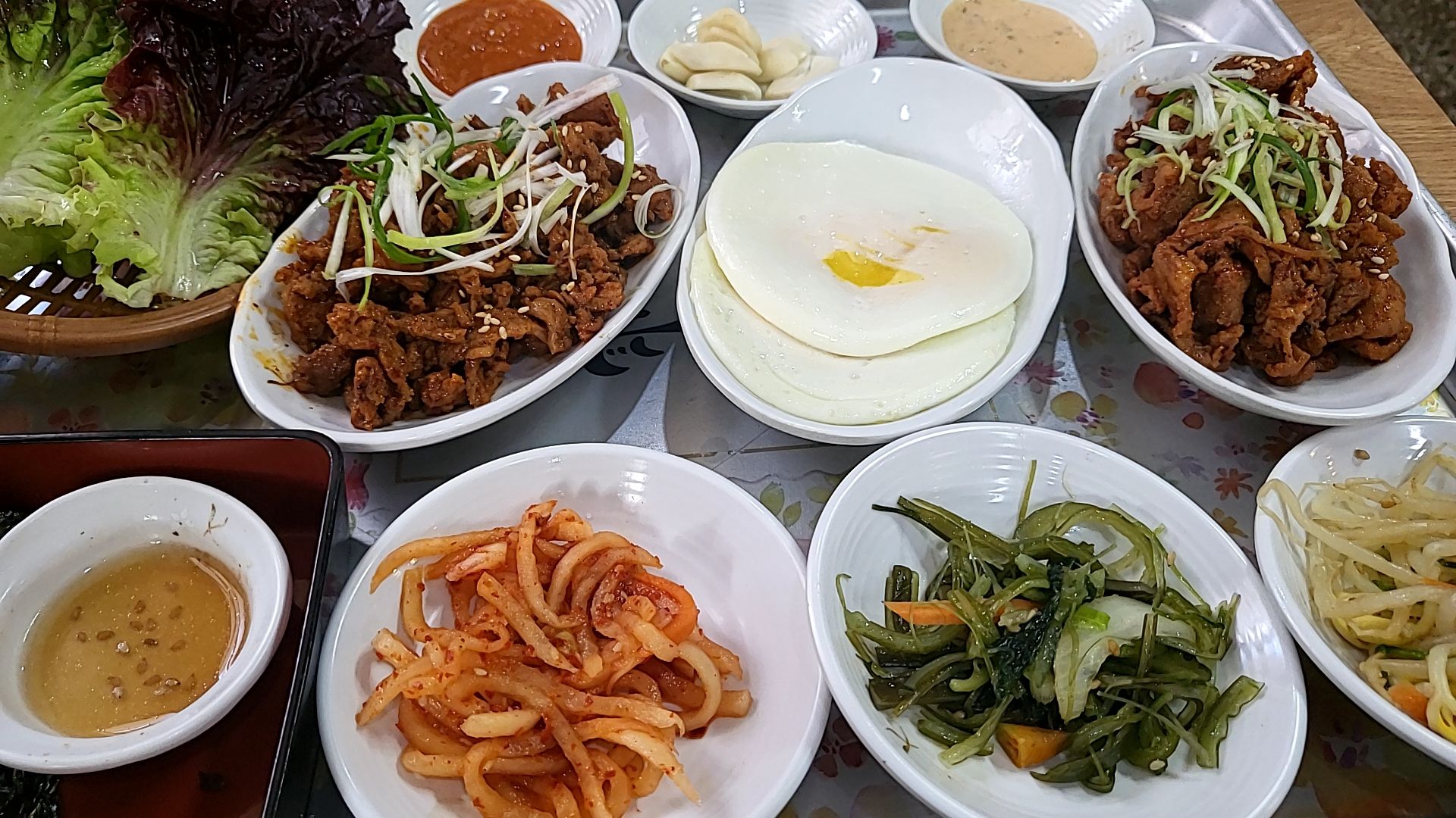 매장 안쪽에 셀프바에는 상추, 초장 케찹 쌈장 등 각종 소스와, 밑반찬을 셀프를 가져갈 수 있게 준비되어 있다. 계란프라이에 케첩을 뿌려먹을 수도 있고, 주황색소스는 돼지불백과 쌈 싸 먹을 때 넣어먹는 소스인데, 같이 먹으면 달달하니 돼지불백과 같이 먹으면 퓨전요리 느낌을 느낄 수 도 있다.