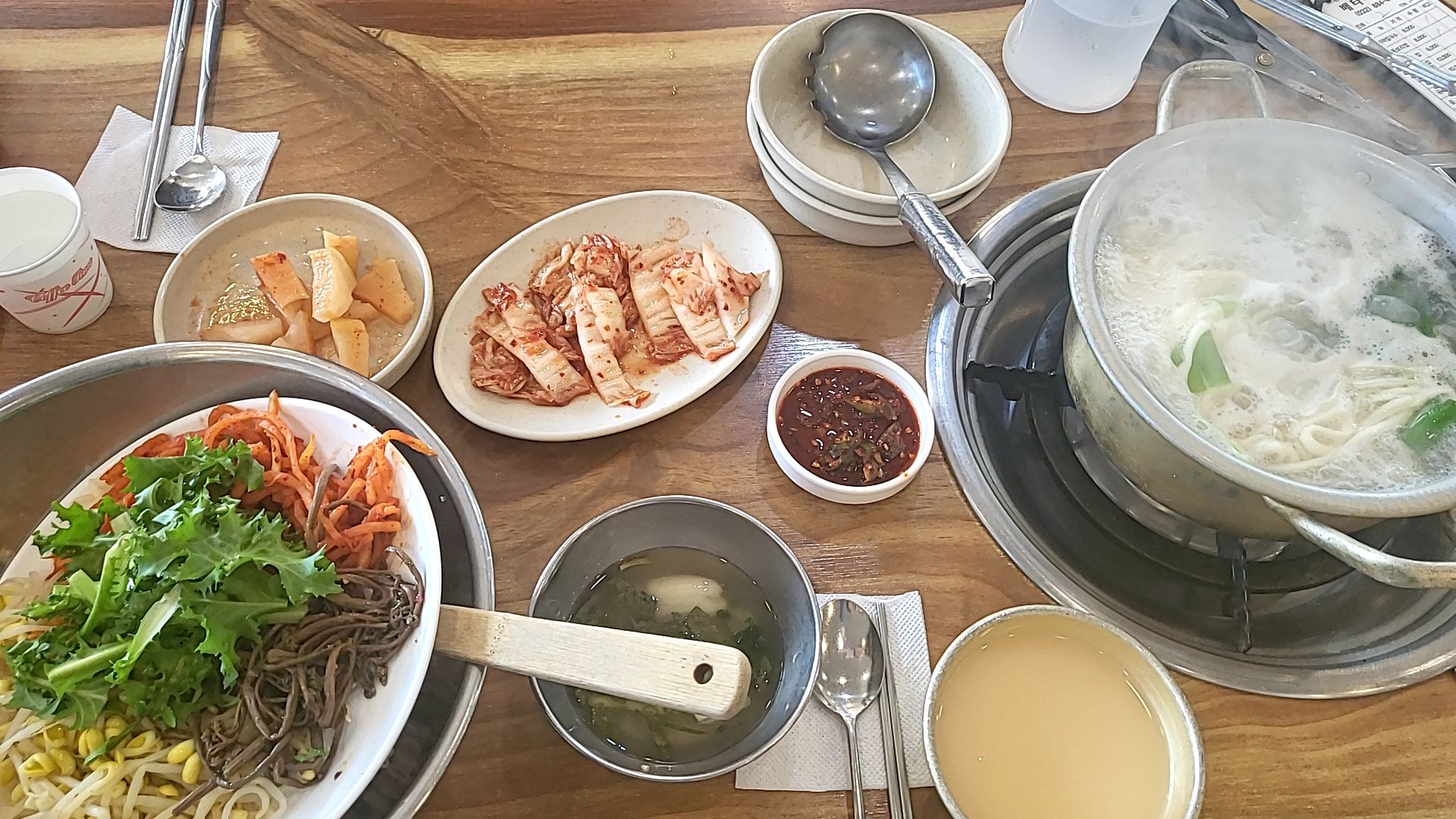 반찬으로는 배추김치, 무김치, 칼국수, 동치미국물, 양념장을 주신다.