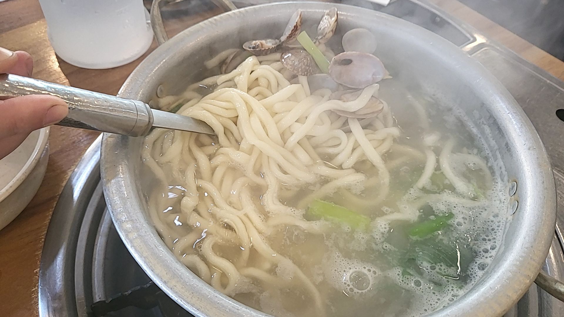 냄비 한가득 칼국수면이 있다. 바지락도 가득이다.