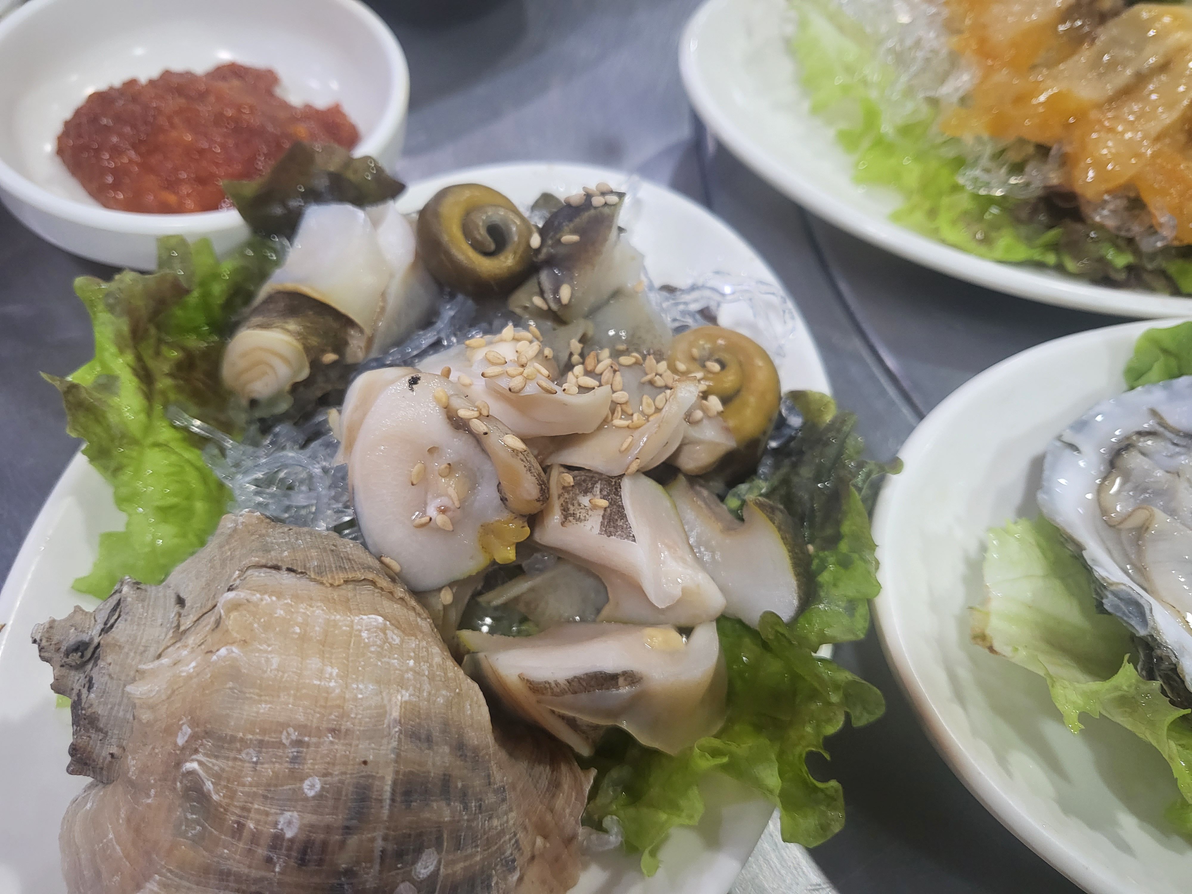 전어구이, 낙지, 멍게, 굴, 소라, 새우, 키조개 등 골고루 나왔다.