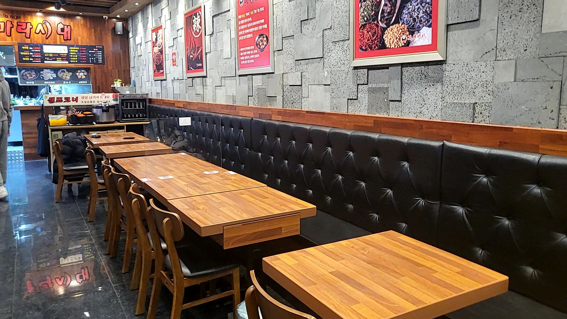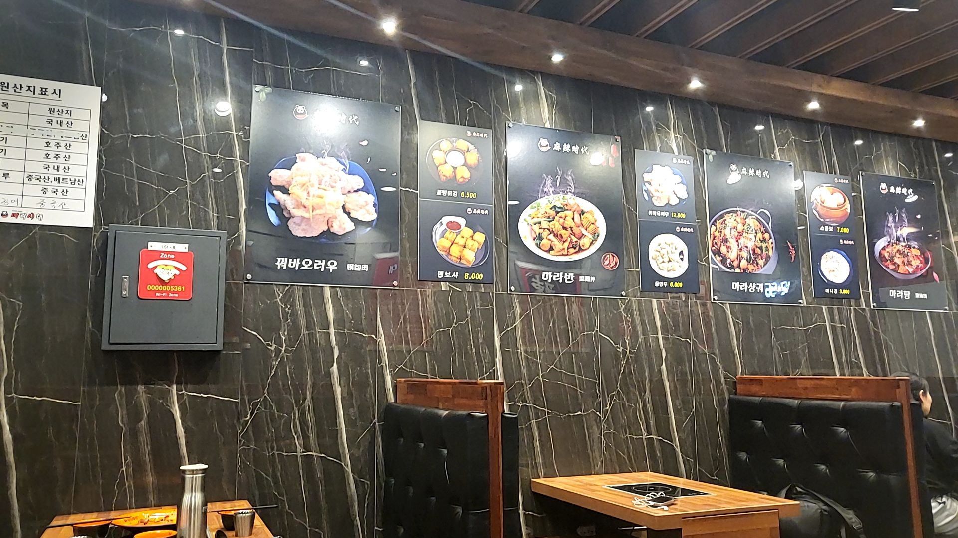 검은색 대리석 벽이 차가우면서도 고급스러우면서 차분한 느낌을 준다. 테이블은 어두운 우드톤에 편한 느낌을 주고, 의자도 검은색가죽으로 되어있어서 마라시대마라탕 매장은 전체적으로 블랙톤이다. 조용히 혼밥 하기에도 좋을 거 같다. 벽면에는 먹음직스러워 보이는 메뉴들이 붙어있다. 꿔바로우, 멘보샤, 소룡포, 마라샹궈 등~ 음식사진을 보니 더 배고파지는 거 같다. 음식 사진 중에 마라반은 마라시대마라탕에서 처음 보는 음식이라 검색해 보았다.