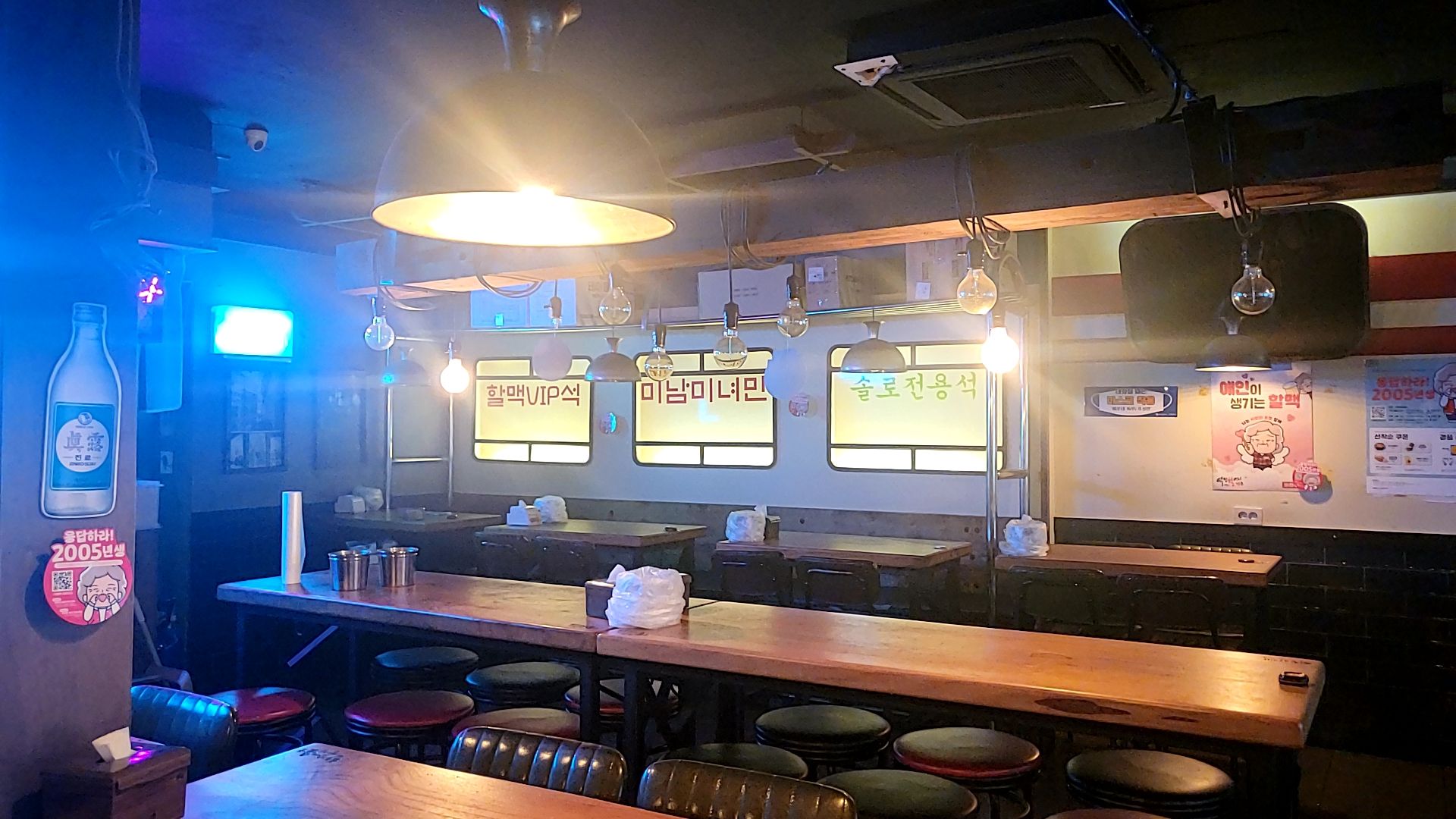 역전할머니맥주 인테리어는 화려한 조명과 바 의자처럼 의자가 높고,