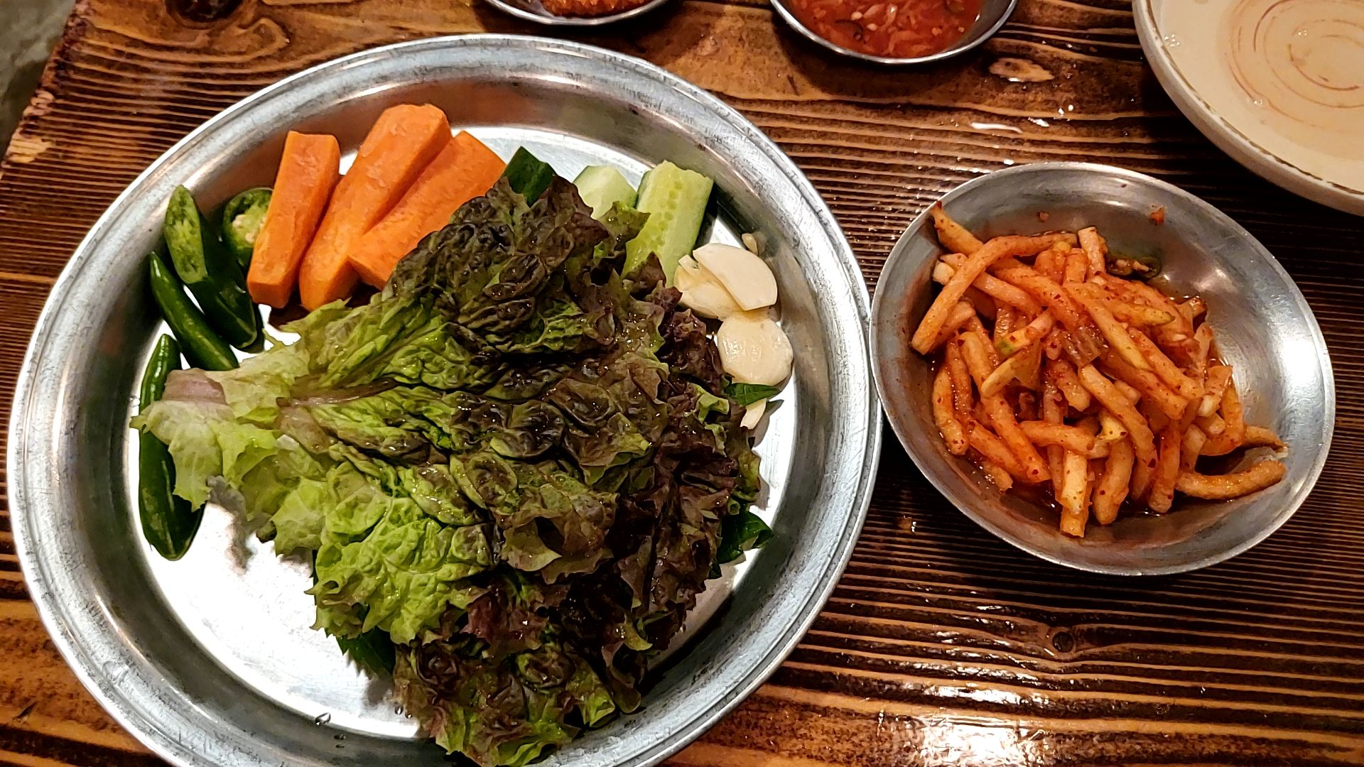반찬으로는 부추무침, 무생채, 쌈야채, 양배추샐러드, 쌈장, 새우젓이 나온다.