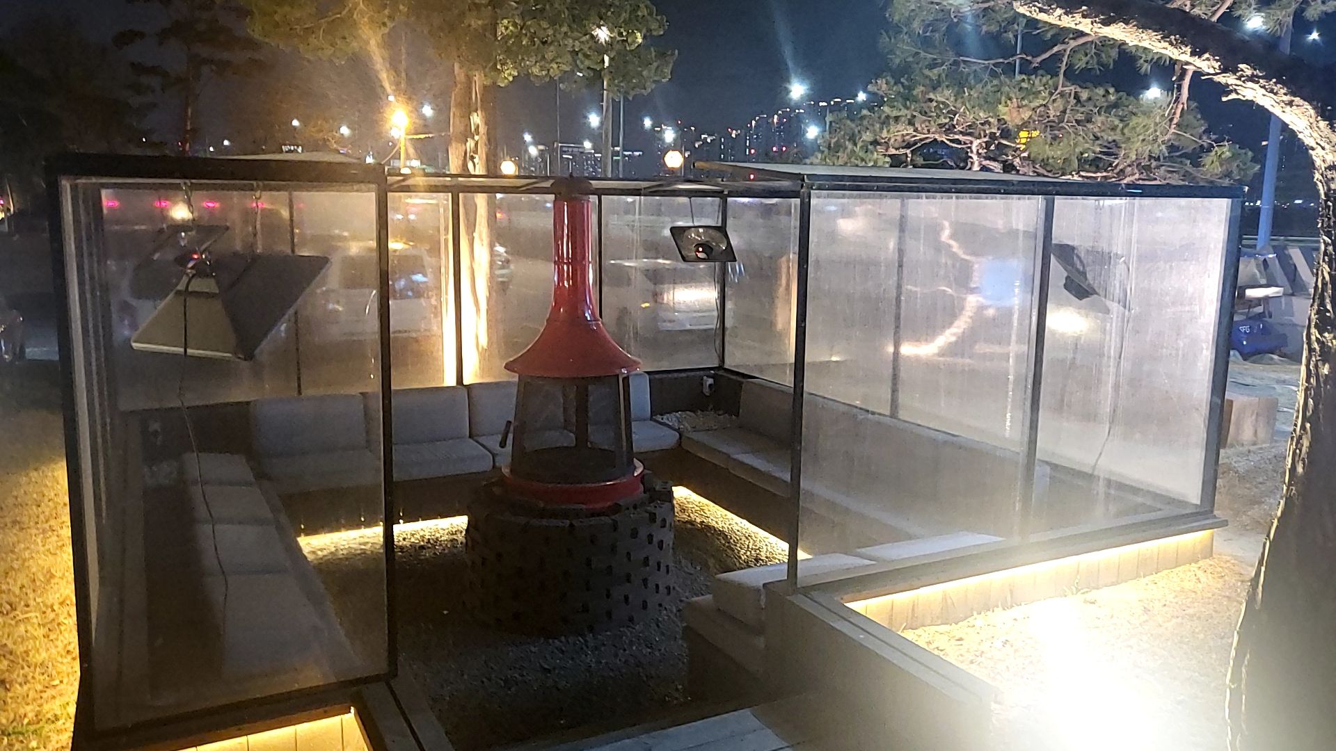비닐이 추운 바람을 막아주고 난로가 있어서,