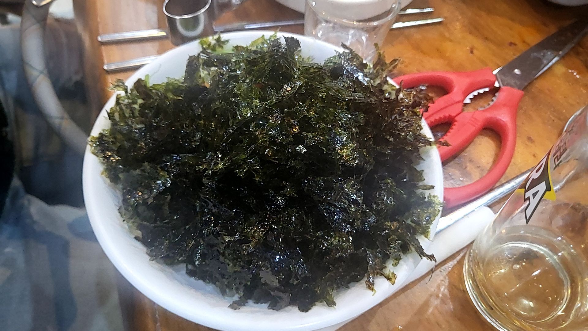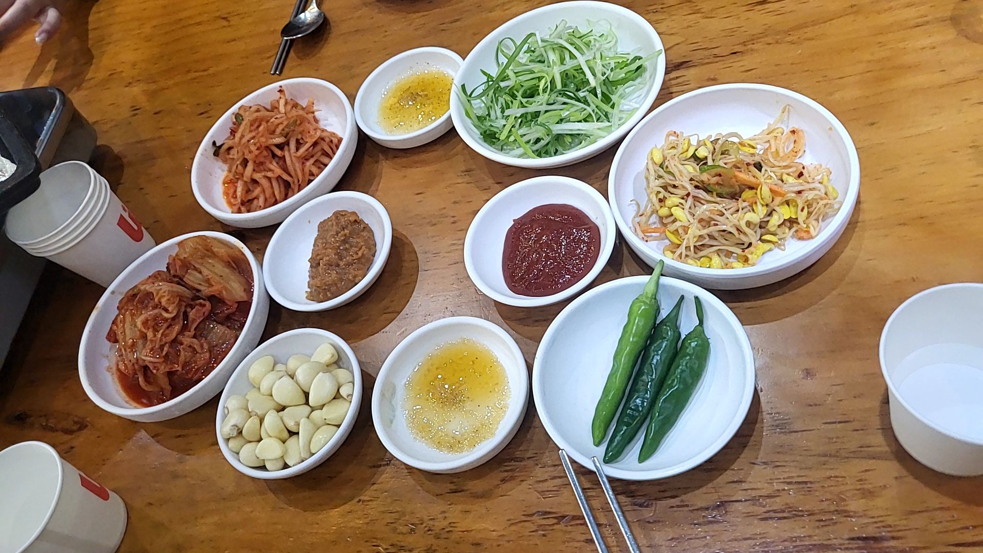 밑반찬으로는 상추, 깻잎, 김치, 파채,