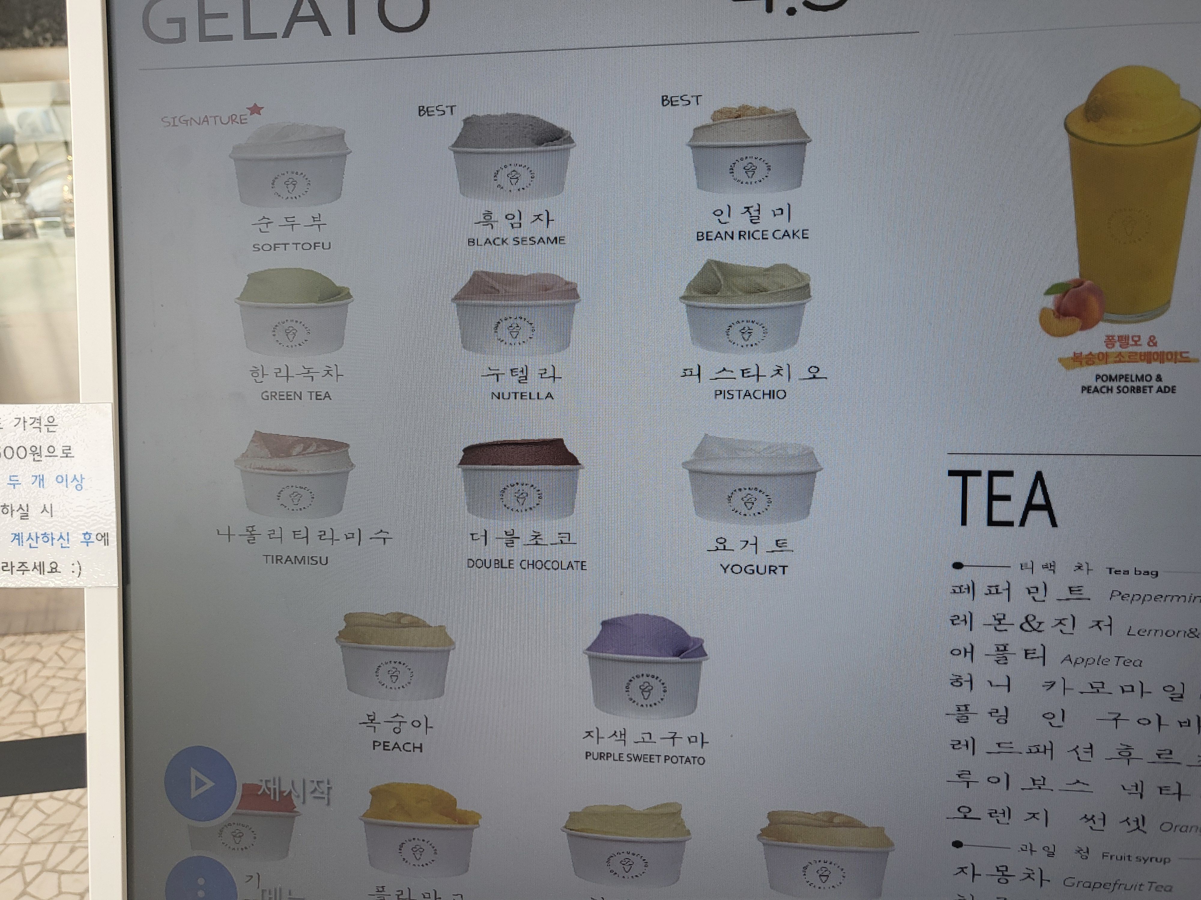 젤라또 맛 종류는 20가지가 넘는다고 한다. 순두부 인절미 아로니아소르베 한라녹차 헤이즐넛누텔라