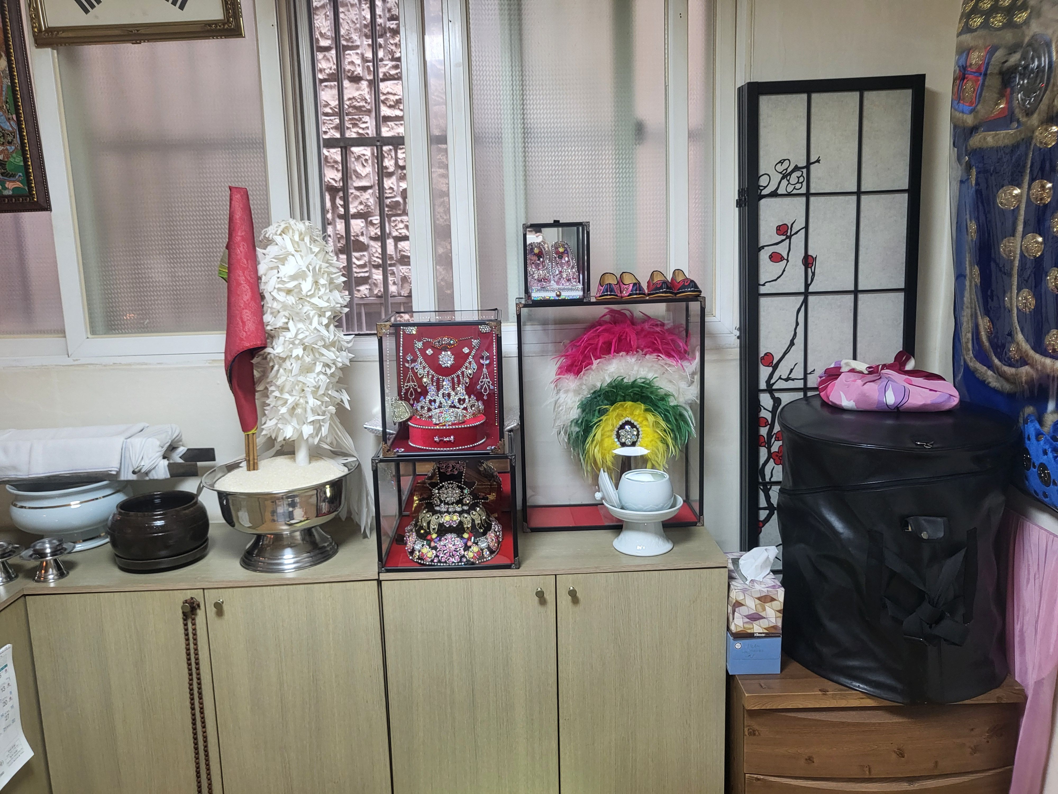 상담테이블에는 물, 쌀, 지팡이, 구슬 등 영화에서만 보던 무당들이 사용하던 도구(?)들이 있었다.