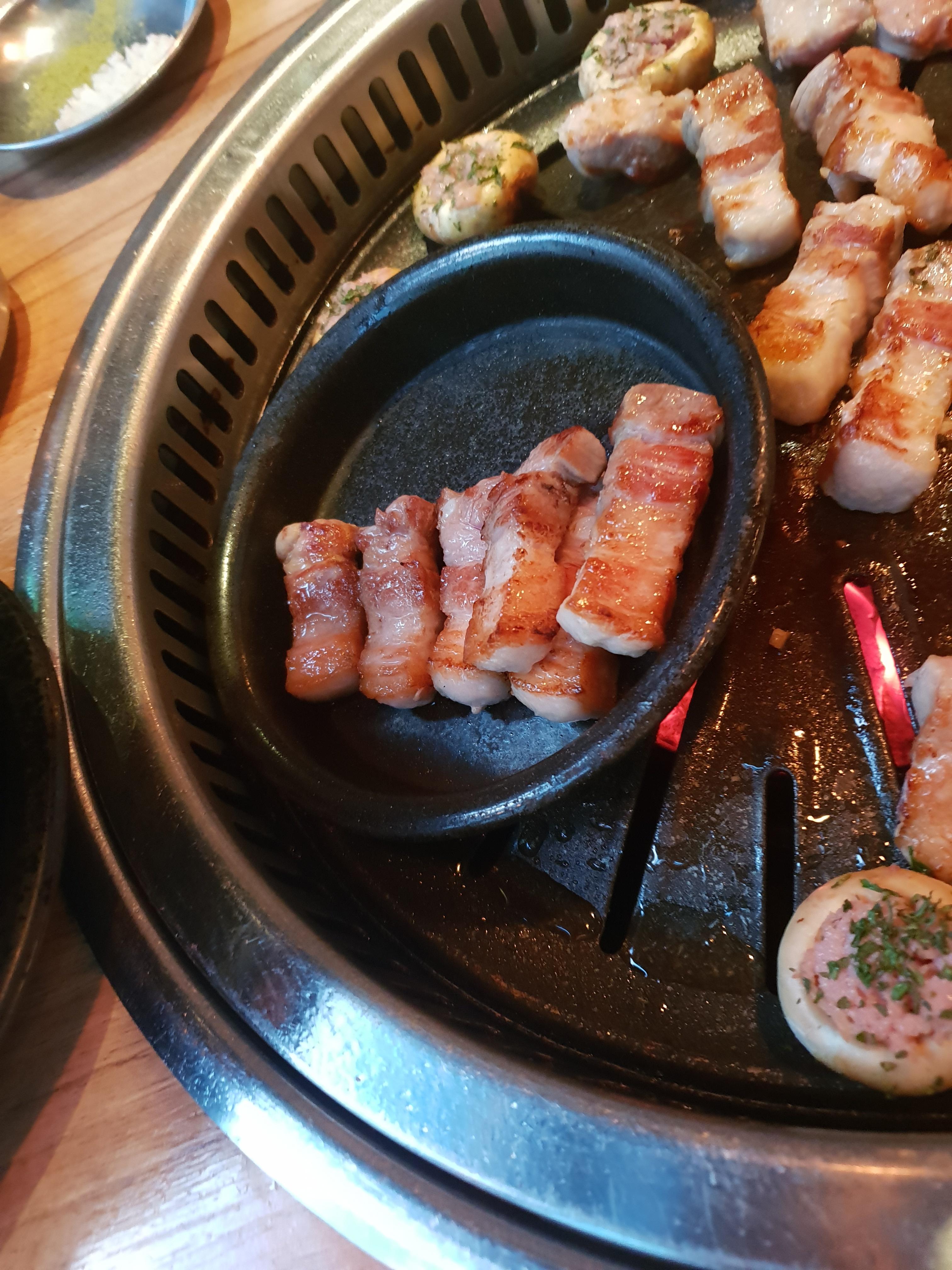 치즈는 살짝 익은 치즈에 고기를 올리고 5초 정도 치즈를 한번 더 녹인후에 같이 먹으라고 알려주셨다. 처음에 살짝 눌려서 굽는 방법 알려주시고 나머지는 샐프로 구워 먹는데, 불을 끈 불판에 치즈를 구우면 금세 치즈가 녹았다. 치즈 뜨거우니 주의.느끼할 줄 알았지만 삼겹살의 고소함과 치즈의 고소함이 합체돼서, 치즈가 식기 전에 얼른 삼겹살과 한입 하면 고소함이 배가된다.
