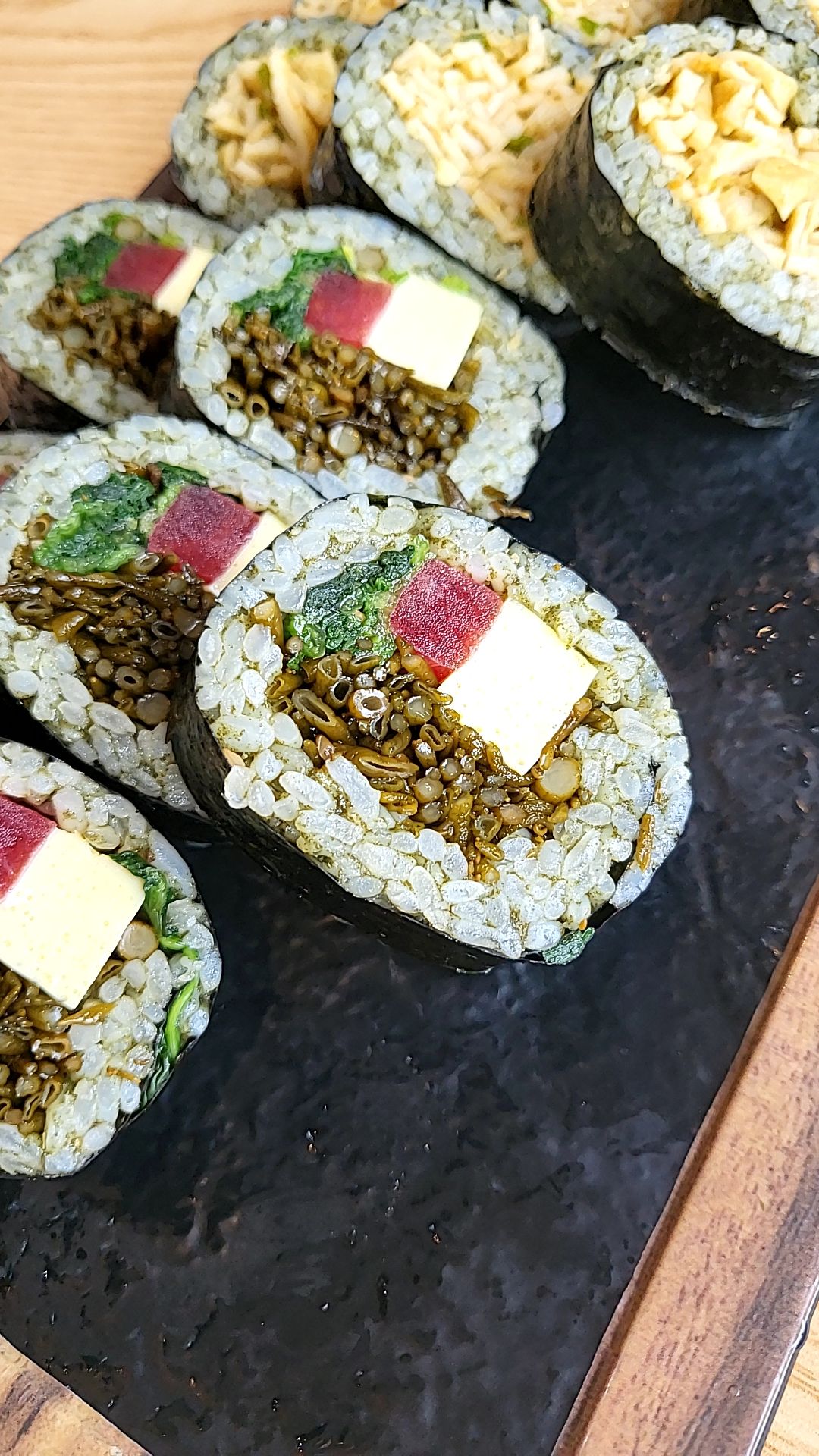 배말김밥을 시키면 굉장히 정갈하게 세팅되어 나온다. 배말칼국수김밥의 배말톳김밥은 김밥 쌀알에 간장양념도 되어잇고, 밥에 보말과 배말을 갈아 양념이 되어있어 초록색을 띤다. 빨강단무지와 노란 계란 톳으로 알록달록 보기에도 좋은 톳김밥. 톳김밥은 처음 먹었을 때는 간이 약해서 건강해지는 맛이었다. 약간 실망하기도했는데, 식초 소스에 찍어먹으니 새콤달콤하니 더 독특한 맛이엇다. 부모님과 함께 오면 좋아하실 거 같기도 하다.배말김밥은 어떤 맛일까 궁금했는데 음미하면서 먹어보면 밥에 배말양념을 해서 끝에 매콤한 맛이 난다. 먹을수록 중독되는 매력 있는 맛. 또한 톳까지 들어가서 오독거리는 식감이 바다를 느낄 수 있는 맛이었다. 해산물 좋아하시는 분들께 추천!!