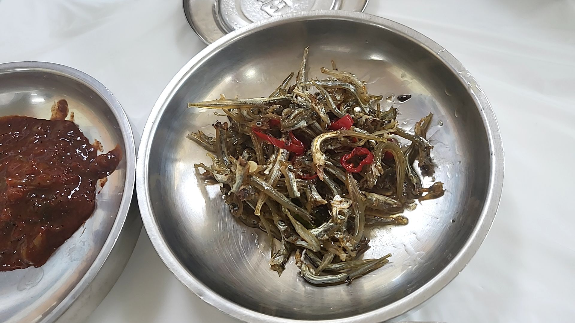 밑반찬으로 오징어게우젓 갈 멸치볶음 콩나물, 열무김치가 나왔다.