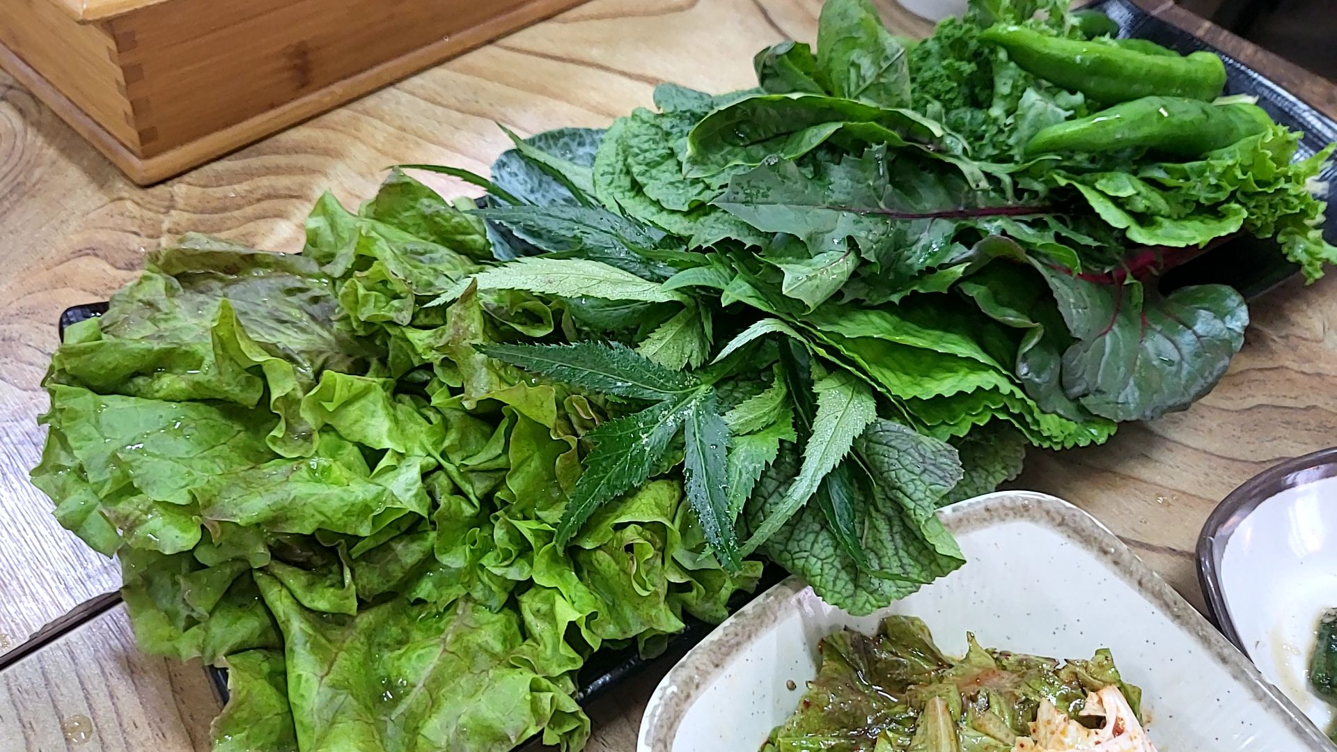 기다란 접시에 다양한 쌈채소가 나온다. 벽면에는 쌈채소에 대한 설명 도나 와 있는데 찍지는 못했다. 치커리, 쑥갓, 셀러리, 비트, 뉴그린, 적겨자 (엄청 매우니 참고 바란다) , 달귀 , 신선초, 로메인, 적근대, 상추, 쌈추, 청오크립, 레드, 아삭이고추 등 약초와 다양한 쌈채소들이 나왔다. 뭐부터 먹어야 할지~ 채소마다 특유의 향이 다르고 식감도 다 다르고! 취향대로 골라먹으면 된다. 다 몸에 보약 같은 쌈채소들!