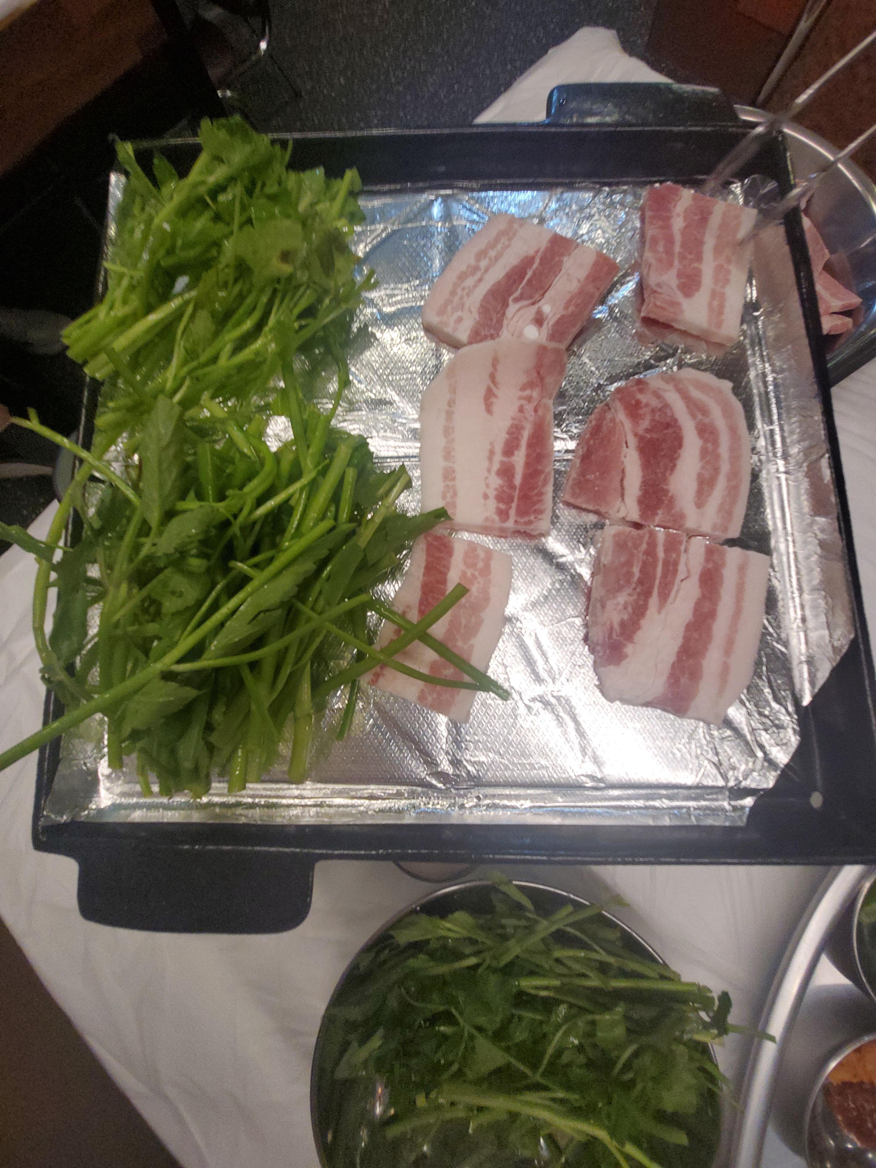 스뎅식당의 호일은 저가 재생원단 호일 취급하지 않고 미식품의약국(FDA) 한국건설생활환경연구원(KCL)의 인증정식 제품이라고 한다. 불판에 호일이 세팅되어잇고 다양한 가니쉬(?) 들이 있지만 스뎅식당의 시그니처인 미나리부터 얹어준다.