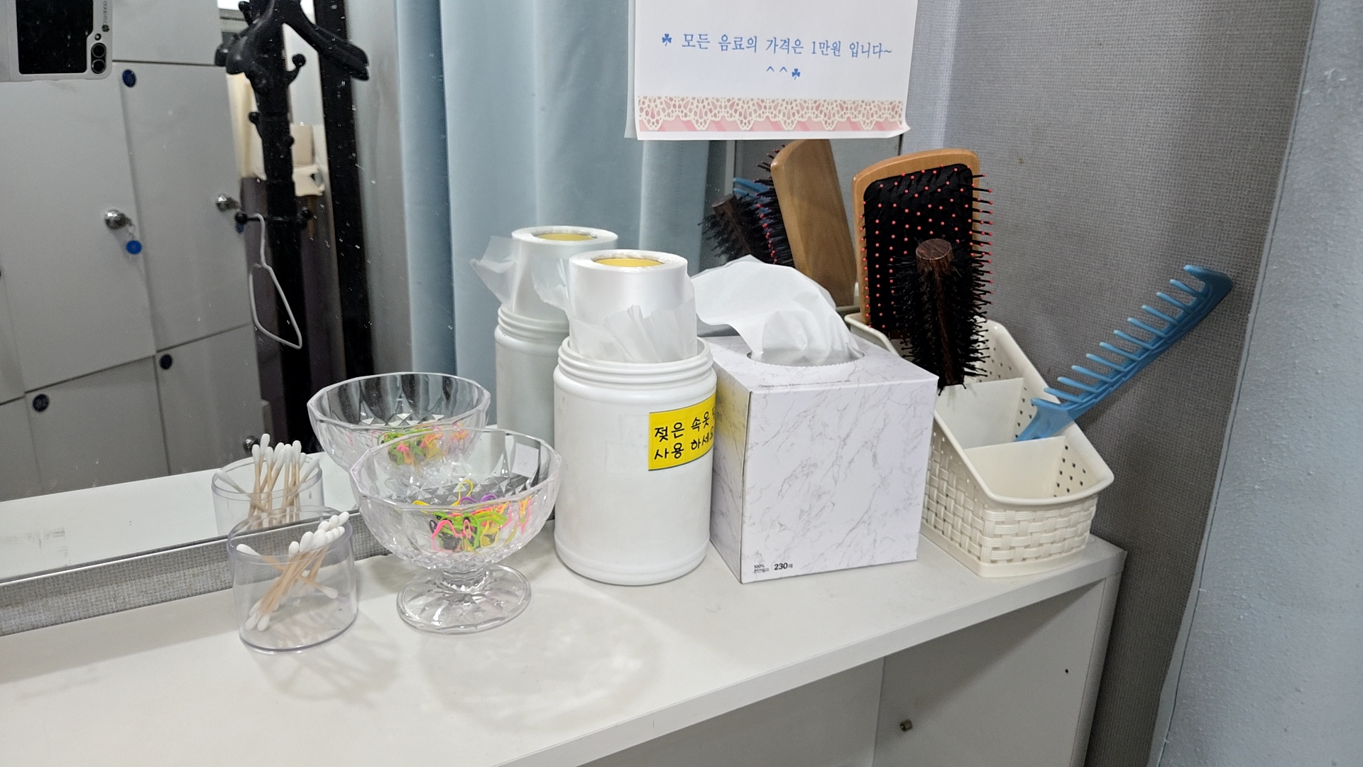 탈의실에는 머리를 묶을 수 있는 머리끈과