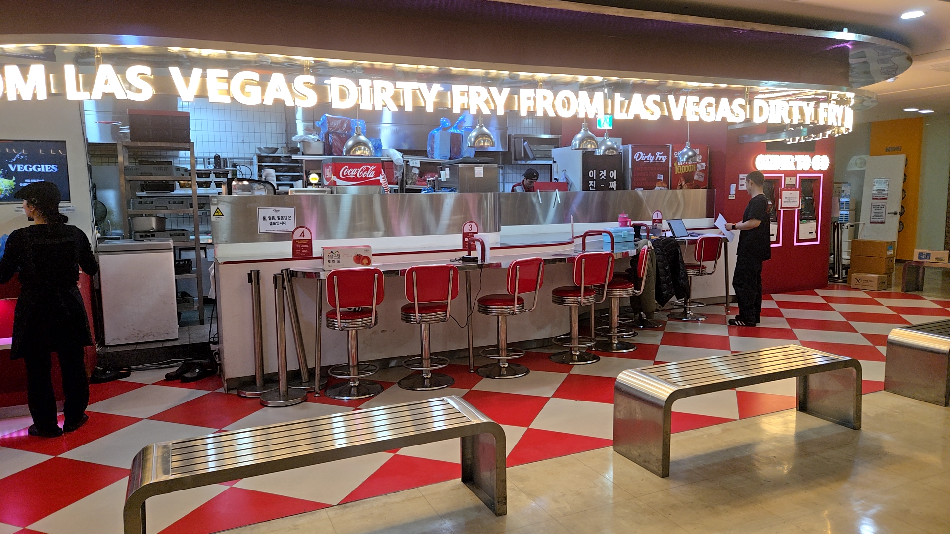 처음에 빨간 조명과 밝은 매장,