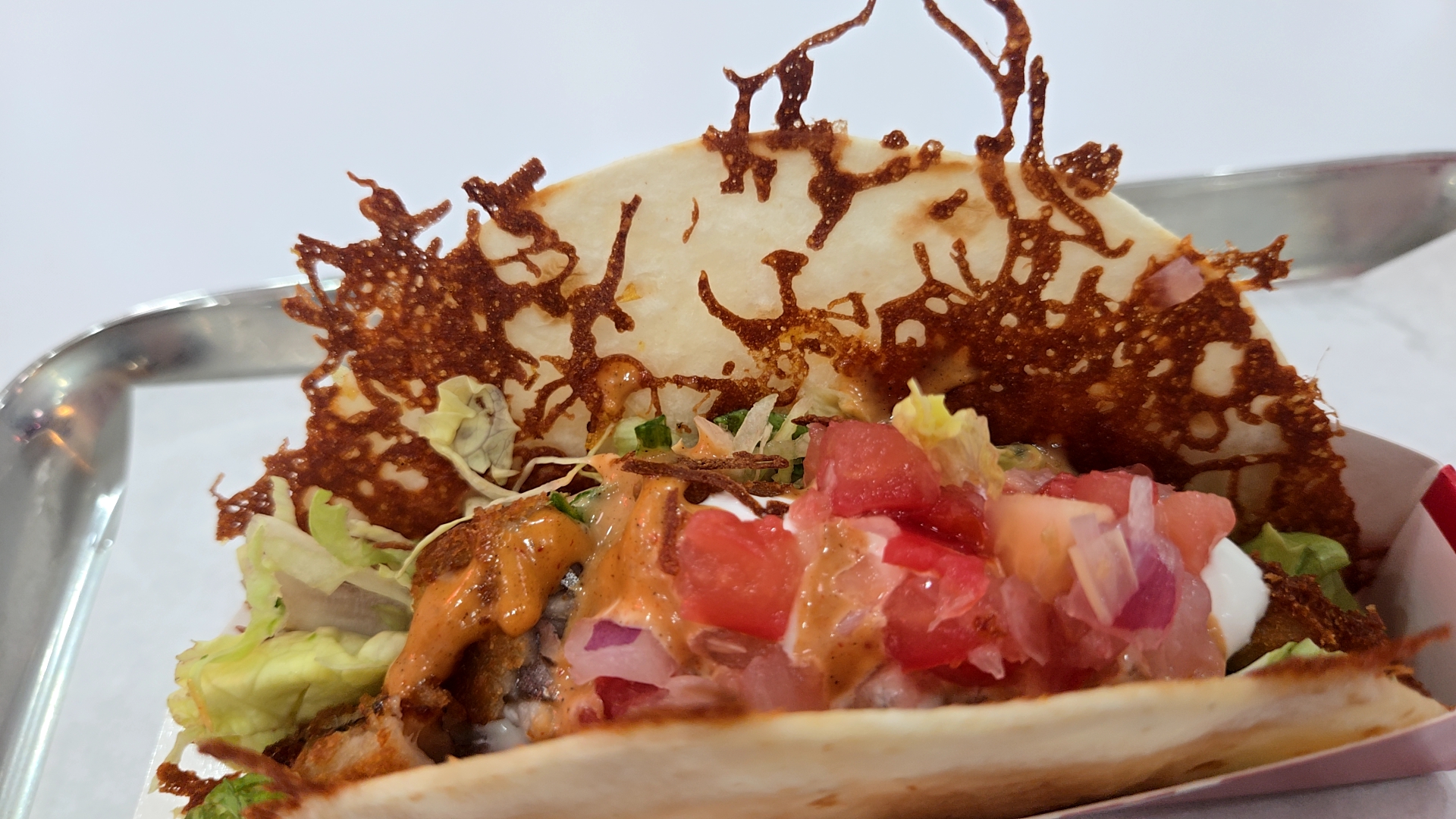 (치즈튀일을 얹은 또띠아에 신선한 야채 가득, 토핑 추가 가능)