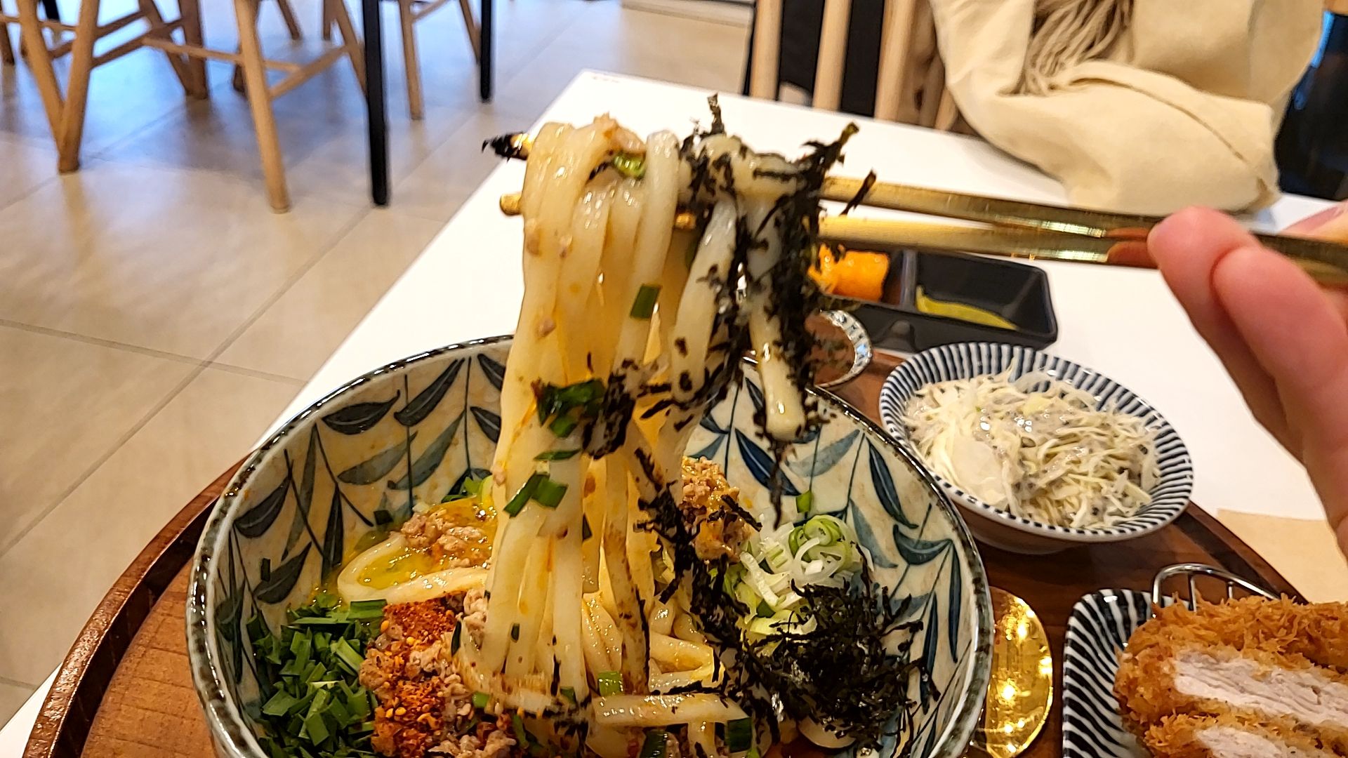 금색 젓가락으로 마제소바를 한 젓가락 집어보니 음식이 더 고급스러워 보인다.