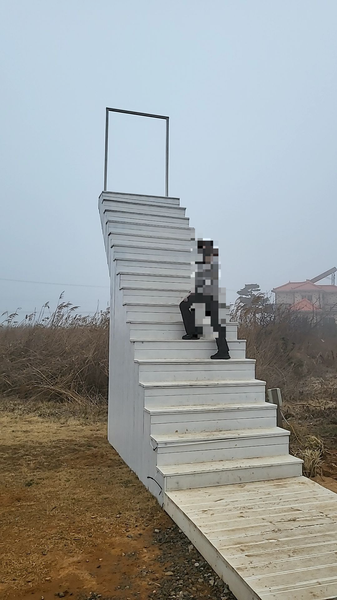 카페는 1층과 2층으로 이루어져 있는데 2층에서는 풀빌라로 이동하는 통로가 있고 1층이 넓어서 테이블에서 커피를 마실 수 있는 여러 공간이 있다. 이미 먼저 와있는 방문객들이 많아서 카페를 구경하다 커피 마시며 이야기를 나눴다. 그냥 가기는 아쉬워서 카페 앞에는 여러 포토존이 있는데, 얇은 빗방울이 한두 방울씩 떨어졌지만.. 그래도 남는 건 사진뿐. 가장 눈에 띄는 천국의 계단 포토존에서 사진을 찍으려고 시도했지만 너무 높아서 끝까지는 못 올라가고 결국은 실패했다. 보기에는 별로 안 높아 보였는데 고소공포증이 있는 데다가 계단이 생각보다 좁아서 올라갈수록 어지러웠다. 사진 찍으신 분들 대단하다.