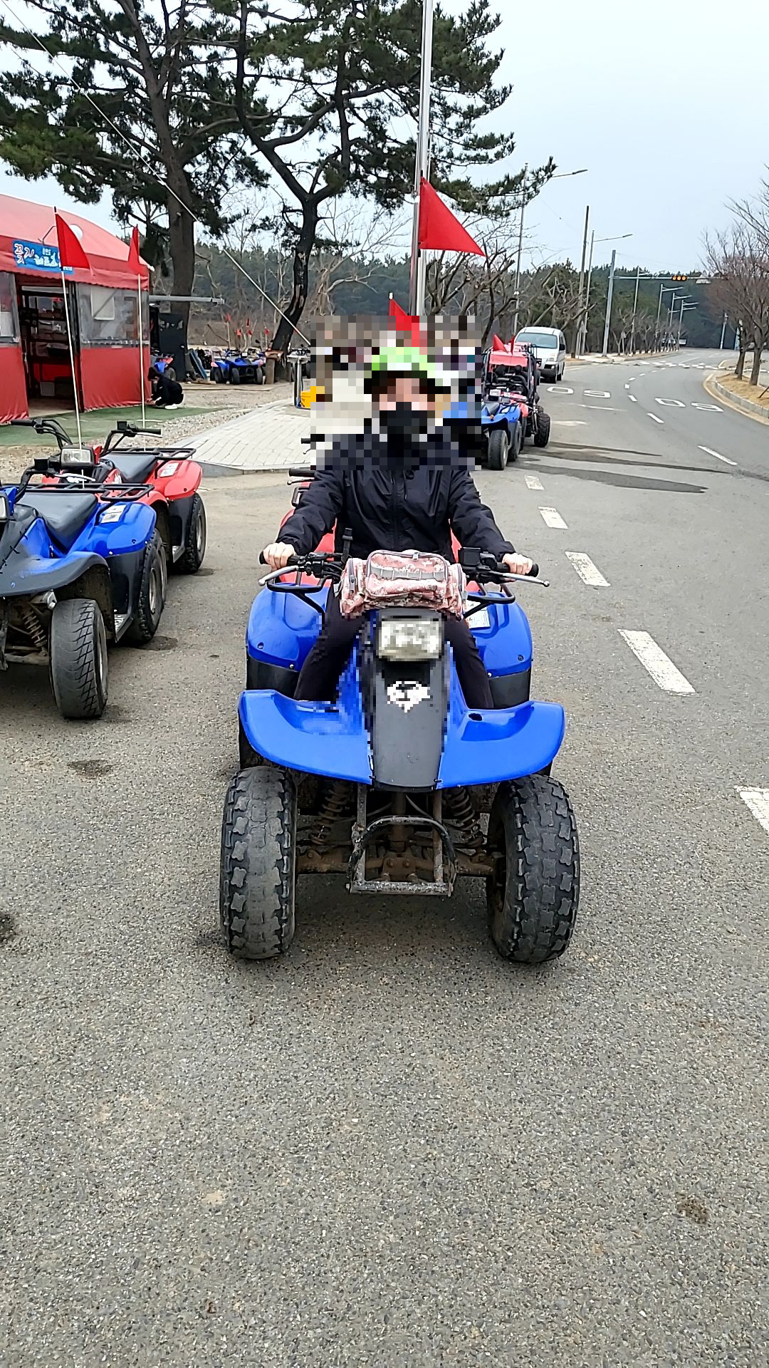 주차를 하고 사륜오토바이를 탈 장소로 이동한다. 생각보다 시설은 낡고 도로 한복판에 오토바이들이 주차되어 있다. 먼저 헬멧을 쓰고 코스 선택, 주의사항 설명을 듣는다. 역시 헬멧은 답답하지만 안전을 위해 꼭 착용해야 한다! 장롱면허를 가진 1인으로써.. 처음에는 좀 무서웠고 사륜오토바이의 엔진소리도 커서 무서웠지만, 처음에 직원분께서 앞에서 인도하면 따라가는 식으로 진행된다. 나중에 해변가에 가면 자유롭게 탈수 잇도록 자유시간을 준다.