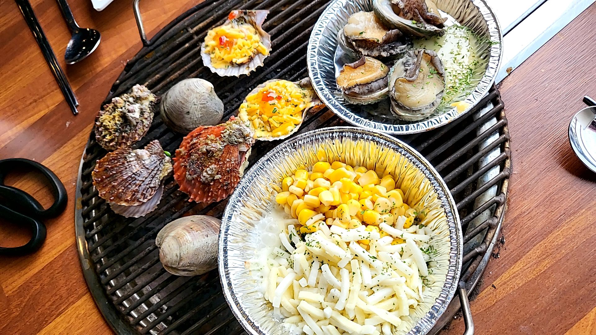 직원분께서 먹는 방법을 설명해 주시고, 치즈가리비부터 구워서 먹었다. 해산물은 오래 구우면 질겨지니 치즈가 녹으면 적당히 구워서 먹어야 한다.조 개 안에 끓는 물이 없어지면 질기고, 조개가 입을 벌린 후 조개물이 끓고 있을 때 먹으면 적당하다고 한다.