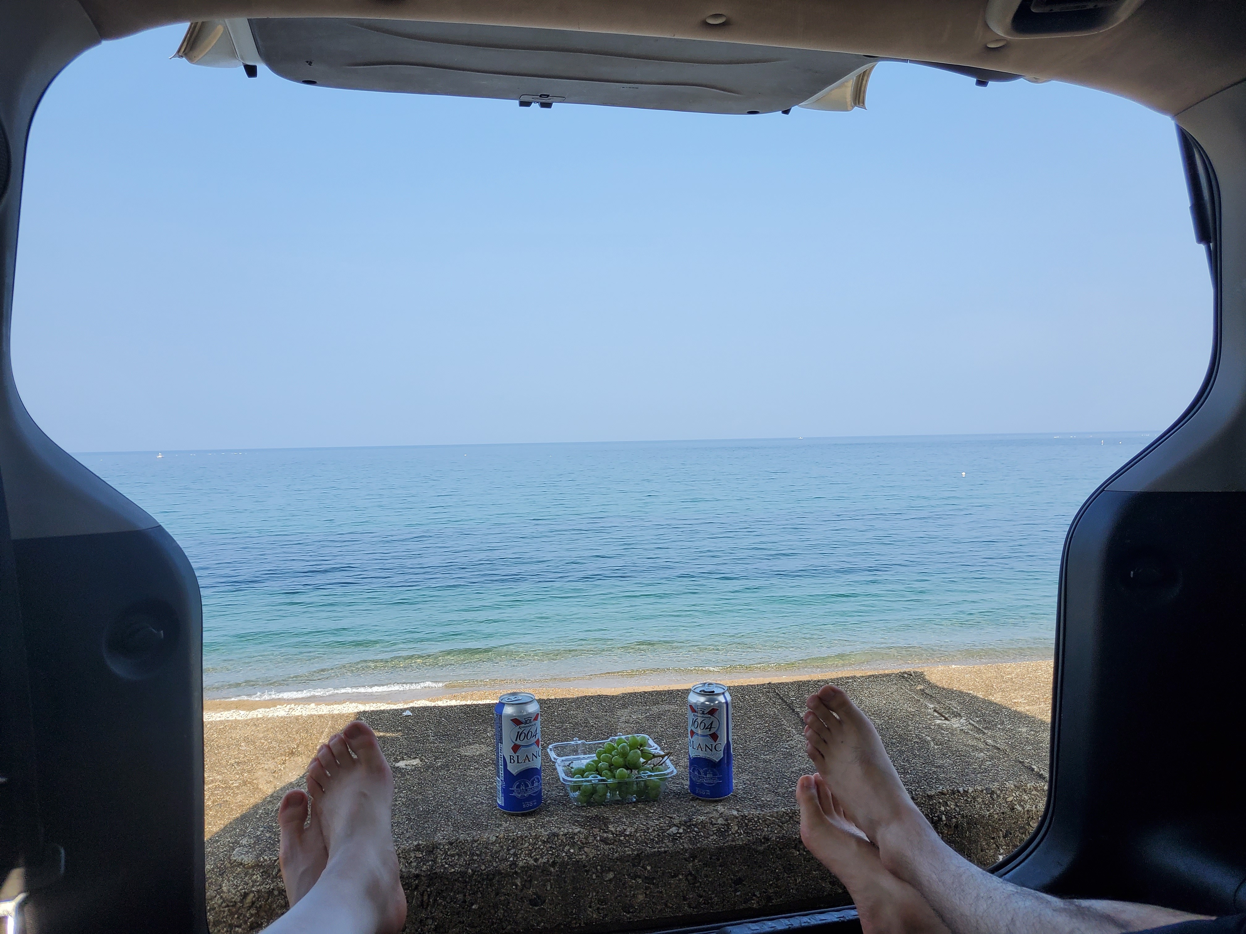 물회도 시원하게 먹고 나니 배가 든든하고 뿌듯했다. 동해 드라이브 한 바퀴하고 도착한 곳은 물치항! 그리고 이 먼 곳까지 온 이유 하나 더 , 차박지로 많이 언급된 물치항으로 차박을 하러 왔다. 낚시도 하고, 장박을 하는 캠핑카도 있고, 이미 먼저 와서 좋은 자리를 차지한 분들도 있었다. 다행히 자리가 있어서 차 뒷문을 열고 멋진 동해바다뷰에 맞춰서 주차를 했다. 찰싹찰싹 파도소리에 파란 동해바다 너무 이쁘다. 역시 바다는 동해바다~~ 조용히 파도소리를 듣고 있으면 마음이 편안해진다. 시원한 바람이 불어와서 땀도 식혀주고. 정말 물치항은 주기적으로 와야겠다는 생각이 든다.