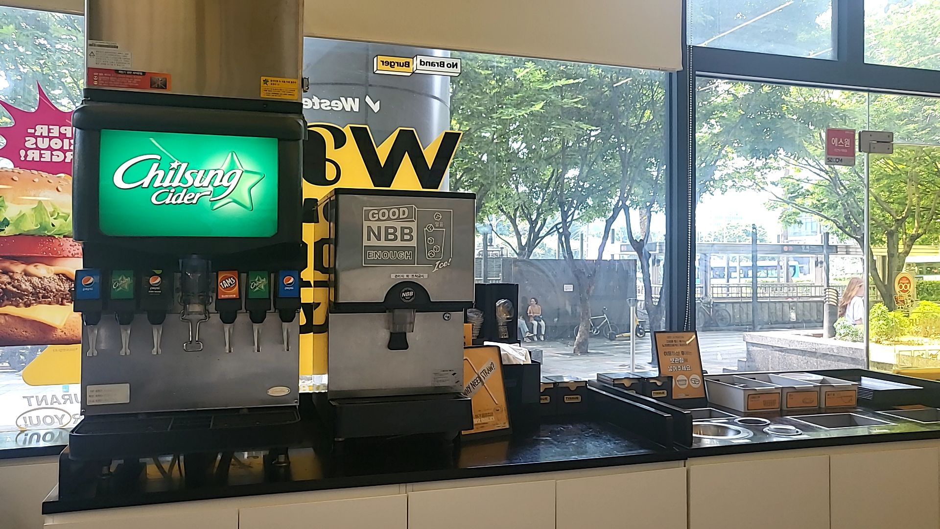 노브랜드버거 양재점 매장의 입구 쪽에는 무한리필 탄산음료수, 테이크아웃 비닐캐리어, 퇴식구, 빨대, 냅킨, 탄산음료 뚜껑, 커피시럽이 준비되어 있다. 탄산음료를 주문하면 음료가 무제한인데.. 노브랜드캔음료 어떤 맛인지 궁금해서 주문해 봤다. 음료대는 비교적 깨끗한 편이었다. 탄산음료 마른 자국도 안 보이고 괜찮았다.