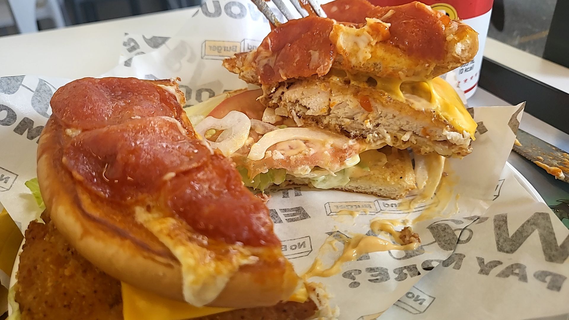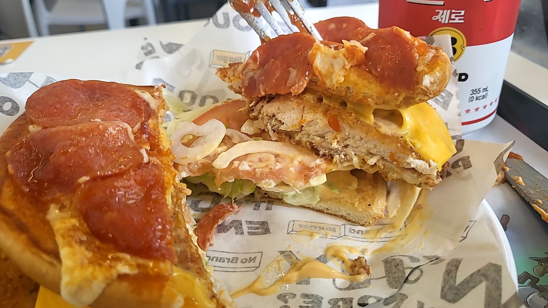 뒤집어진 번에 페퍼로니와 치즈가 가득 페퍼로니피자치킨버거