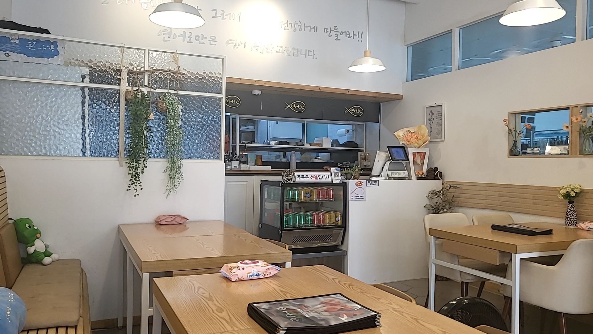 테이블은 4인석 테이블 4개 정도 있다. 우드테이블과 화이트인테리어의 조합으로 깔끔하면서도 안락한 느낌을 준다.