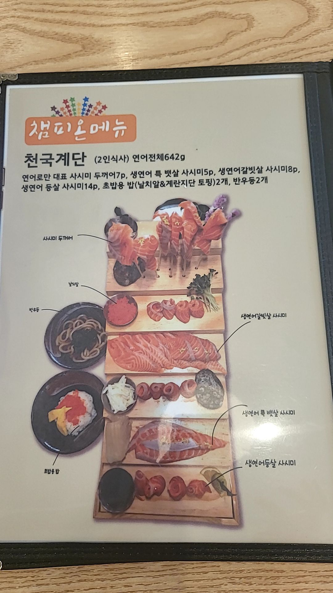 메뉴는 연어사시미, 연어초밥, 사케동, 연어파스타, 우동, 와규초밥 와규샐러드 단품초밥도 있다.