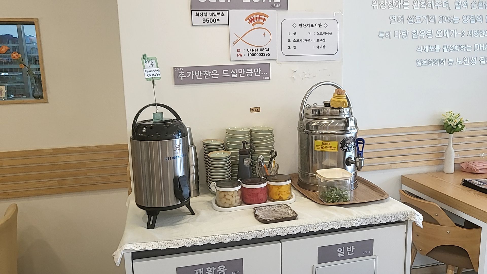 그리고 추가반찬은 셀프바에서 갖다가 먹을 수 있다. 셀프바에는 물, 육수, 락교, 단무지 등 이 있다.