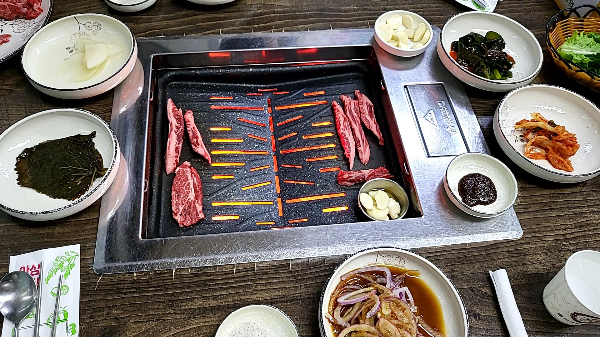사장님께서 등심 갈빗살 살치살 순서로 먹는 것을 추천하셨다. 숯불은 아니었지만, 원적외선 불판으로 화력도 좋고 기름도 튀지 않아서 좋았다.