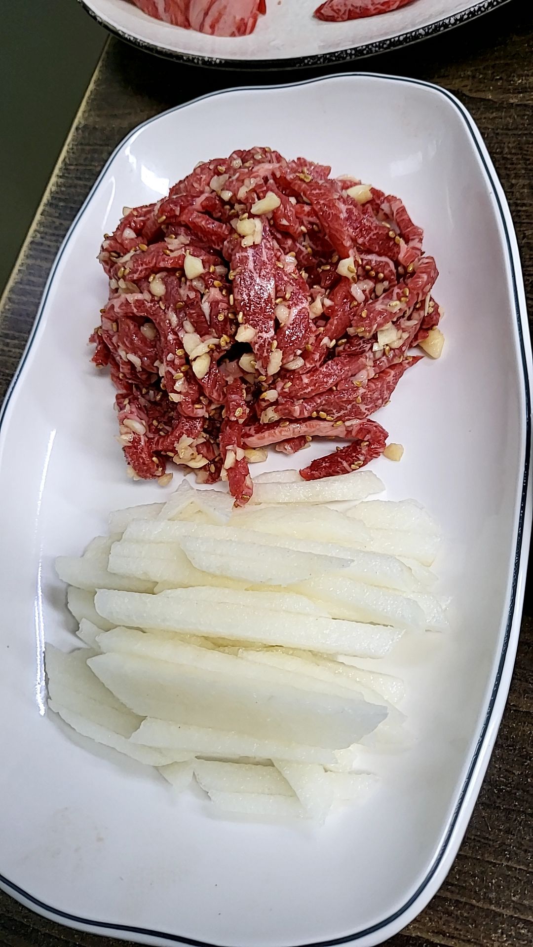 매장은 좌식으로 되어있고 큰 테이블 3개가 있다. 모둠, 육회, 맥주를 주문했다. 먼저 반찬을 세팅해 주신다. 밑반찬으로는 한우구이 함께 먹기 좋은 무절임 깻잎 미역초무침 김치 상추 양파절임 등이 나온다.