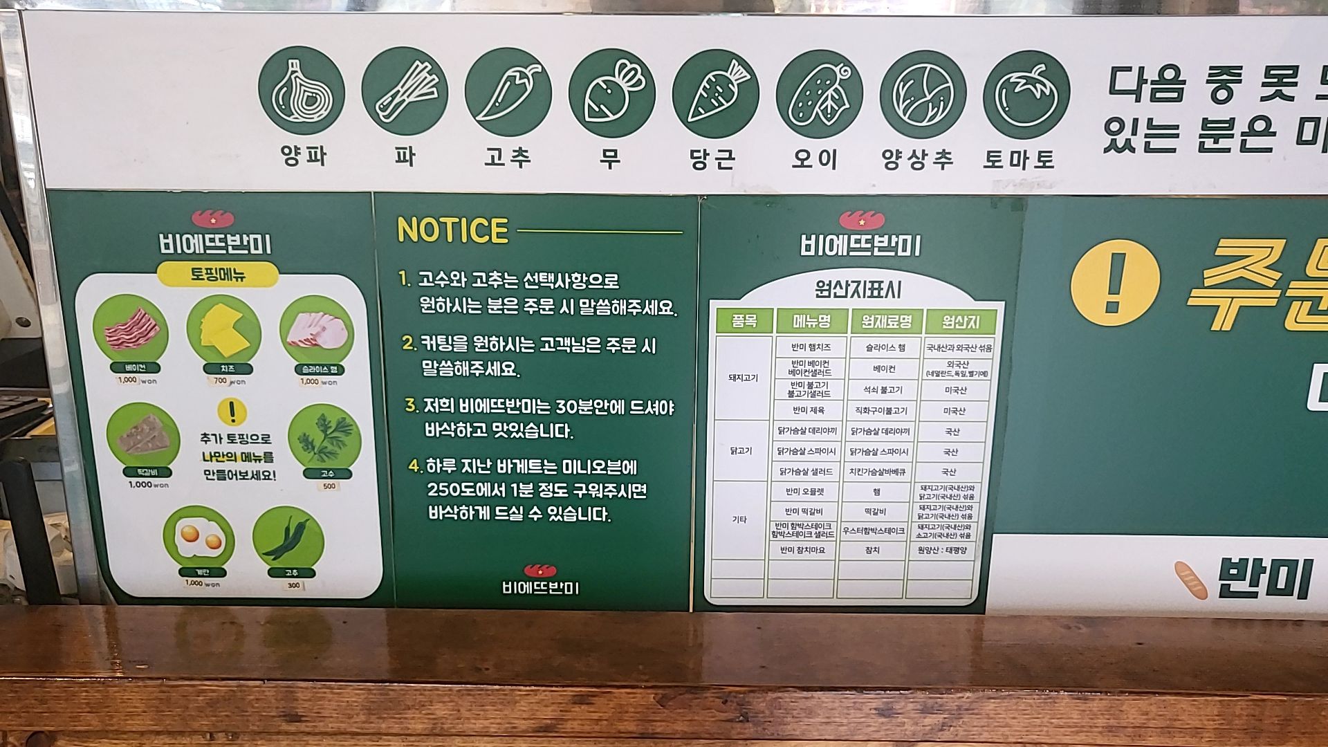 비에뜨반미에는 반미전문점으로 다양한 반미가 있다. 오믈렛, 불고기, 치즈스테이크, 야채, 참치마요, 닭가슴살, 베이컨, 치즈, 생크림, 거기에다가 곱창반미까지, 요즘 곱창이 유행이라지만 곱창이 들어간 샌드위치는 비에뜨반미에서 처음 본 거 같다. 그리도 스프, 커피, 에이드 등 다양한 음료도 판매한다.