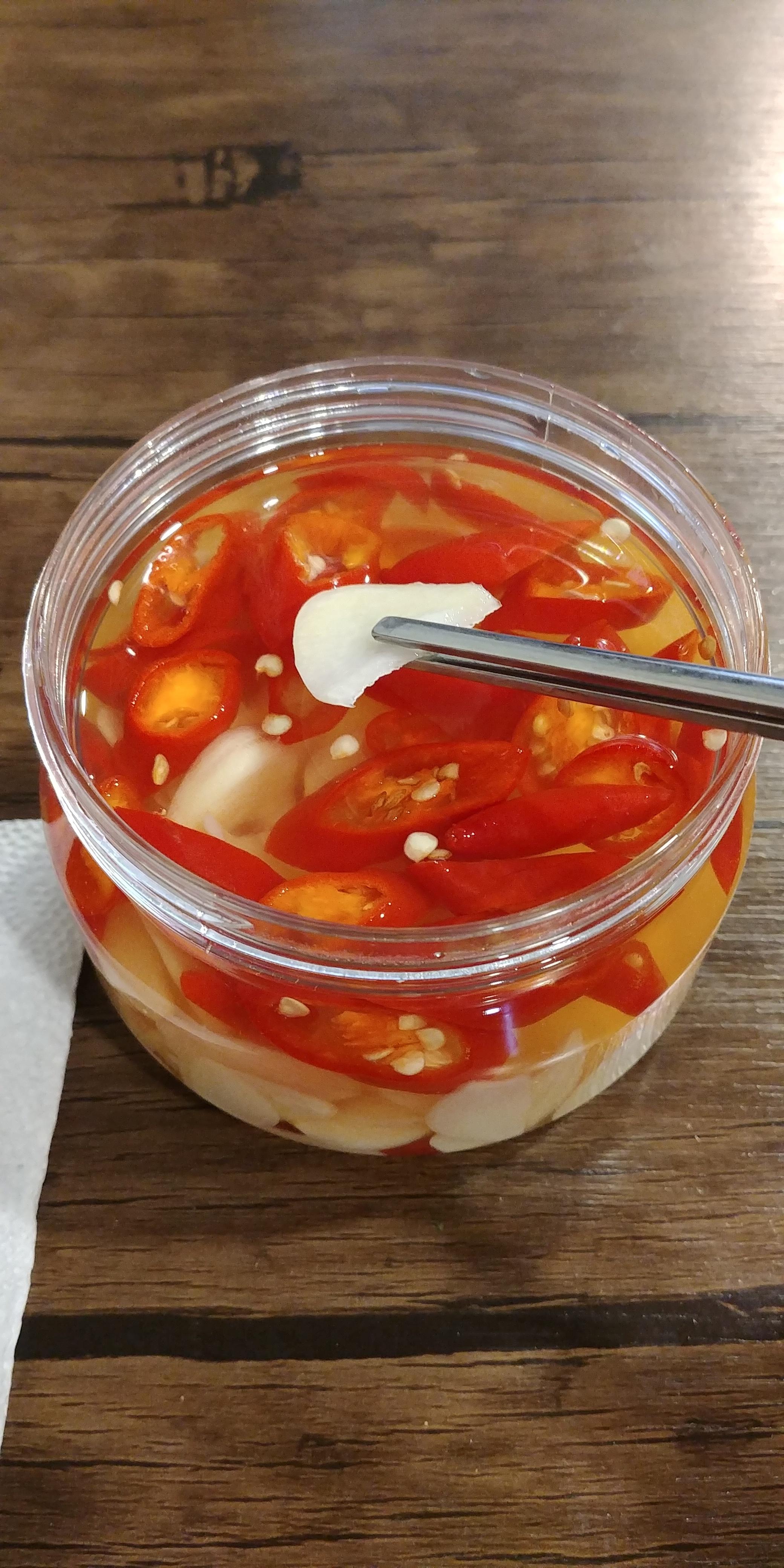 홍고추와 슬라이스 마늘로 만든 피클이었다.