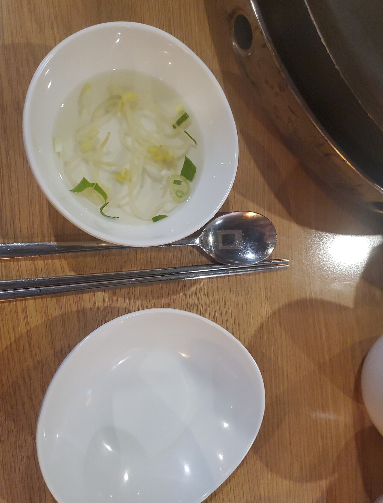 샐러드 피클 단무지 콩나물 국물이 있다.